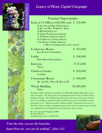 The Vine is proud that the lobby will be named by the Doris Burwell Foundation. The Community Room will be named by Mr. and Mrs. Harry B. Brock, III. One counseling room will be named by Bill and Judy Case, and another will be named by Newell and Mary Witherspoon. Contributors to the Campaign include: Bob and Julie Broadway, Ken and Lea Ann Barnett, Buck and Nancy Brock, The Doris Burwell Foundation, Pam Barratt White, Newell and Mary Witherspoon, Bill and Judy Case, Mr. Don Wolfe and Mrs. Sarah Curtis, Lou and Joanne Horn Foundation, A Donor Advised Fund of the U.S. Charitable Gift Trust, Dr. and Mrs. William C. Stone, Drs. Ike and Rebecca Nelson, Drs. Amanda and Jack Ragland, Scott and Susan Booth, David and Amy Harbarger, Bill and Maureen Lokken, Tom and Donna Coon, Doug and Karen Madison, Pattie and John Cline, Dennis and Rosemary McMahan, Dr. Ralph and Rev. Kimberly A. Mitchel, Mr. Scott and Rev. Margaret Ames, David and Angela McKenzie, Elaine and Brian Leffel, Carol T. Mebane and John S. Mebane, Joanna Antonios, Kevin and Connie Wilson, Worth Stuart, Cheryl Johnson, Brenda McGhee, and 11 Anonymous Donors.